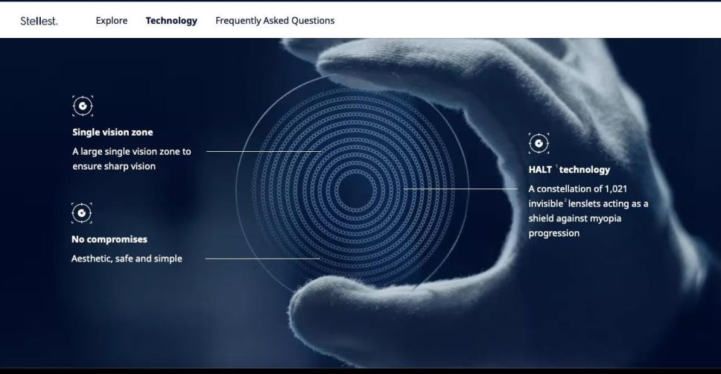 Mae lensys sbectol Essilor Stellest yn lensys sbectol gyda “lensys asfferig”. Mae gan lensys ardal glir o 9 mm mewn diamedr yn y canol, sydd wedi'i hamgylchynu gan gylchoedd o lensys ymylol (dotiau bach, wedi'u codi) ar weddill y lens.